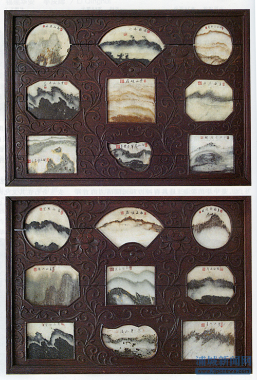 (鑒藏者 陶正晨) 云山古寺勝跡位于江西省瑞金市城西19公里處。云石山高不到50米,方園不足千平方米,山上只有一座小小的古寺廟,此山的地理風(fēng)貌非常奇特,是在平地方凸起的一座小山,山上怪石林立,樹木繁多,景色怡人,四季如春。1934年7至10月,這里曾是中央蘇維埃共和國臨時中央政府所在地,并以"長征第一山"而聞名。正如山上寺廟對聯(lián)所言:"云山日詠常如畫,古寺林深不老春"。從遠(yuǎn)處看,山巒猶如仙女回宮時遺留在凡間的花籃。云石山四面懸崖峭壁,只有一條石砌小道直達(dá)山頂,中途還有兩道石門屏障。山上的密林中孤立一塊巨石,毛澤東當(dāng)年經(jīng)常在這里讀書。 云山古寺也是紅一方面軍主力和中央機(jī)關(guān)長征的出發(fā)地,許多黨史學(xué)家和中央領(lǐng)導(dǎo)都稱之為"長征第一山"。 中國傳統(tǒng)觀賞石中,云南大理石久負(fù)盛名,其中以綠色為佳,天然形成的山水云煙如米氏畫境者為貴。 這對框架均為櫸木做的大理石掛屏,制作于清中期,每扇規(guī)格52.5*37.5厘米,浮雕精美纏枝西番蓮紋,和諧統(tǒng)一,中間各鑲嵌著9片大理石作為裝飾,9是數(shù)字中最大的一個,代表長久、權(quán)威、尊貴等吉祥之意。還保持完好的狀態(tài),未見難得,最珍貴的是里面的大理石反映了清代文人神靈詩韻,里面怪石多,蒼石粼粼,雕刻完美。代表著我們浦城文人雅士具有很高的人文藝術(shù)氣質(zhì)和精神境界。雖然年頭較久,但櫸木光澤依舊,紋理清晰可見。