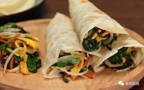 春餅(薄餅) 端午節(jié)家家還有吃薄餅的習(xí)俗。薄餅是采用精白面粉調(diào)成糊狀,在又大又平的鐵煎鍋中,烤成一張張形似圓月,薄如絹帛的半透明餅,然后用綠豆芽、韭菜、肉絲、蛋絲、香菇等作餡,卷成圓筒狀,一口咬去,可品嘗到多種味道。