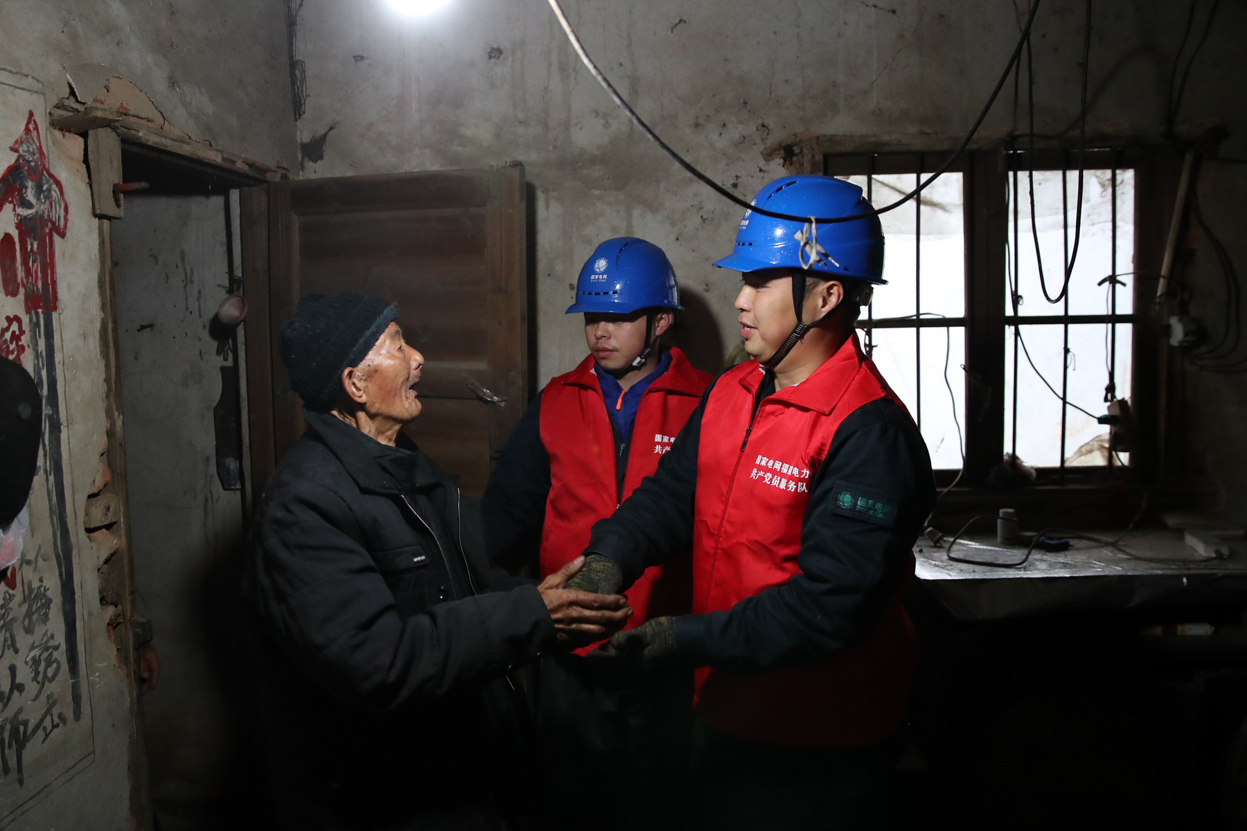 12月20日,浦城縣供電公司共產黨員服務隊為獨居老人劉傳岳安裝新線路。李義友 攝 “共產黨好,共產黨好!”12月20日傍晚,浦城縣橫山北路215號獨居87老人劉傳岳緊緊握著浦城縣供電公司城區配電搶修班顏順峰的手一直說個不停。 劉傳岳今年2月27日家中突然斷電,由于他是獨戶獨居,加之喪失聽力,無法與人交流,所以沒人知道他的情況。就這樣,沒電的日子一天天艱難的過去了。