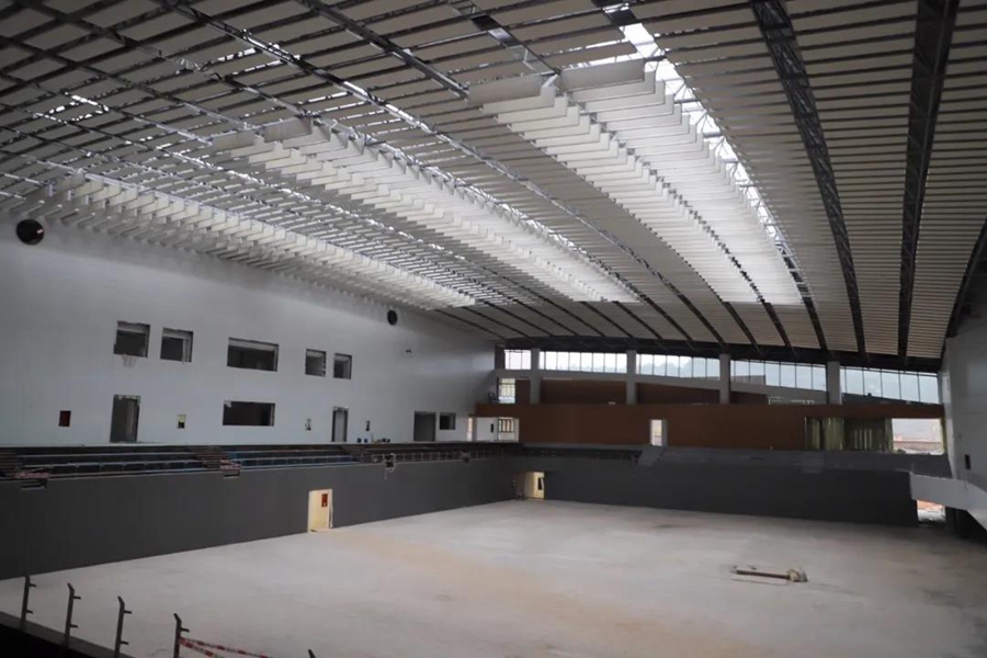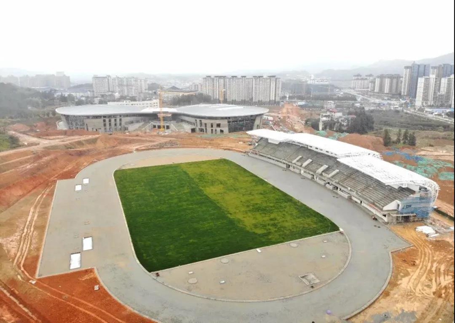 浦城縣全民健身中心。何周超 攝 在新城,一個占地面積151畝,建筑面積4.8萬平方米,總投資5.39億元的浦城縣全民健身中心依山而建,室內籃球、排球、羽毛球、武術、游泳等場館,室外的籃球場、足球場已搭建完成。 2月11日,筆者走進浦城縣全民健身中心,室外工人們正在冒雨搶工,壓實跑道,室內工人在拆除、搬運腳手架,全員全力備戰省運會。“針對浦城近期的陰雨天氣,我們通過搭棚等方式努力克服,保證按時完成工期。”項目負責人黃自健說。