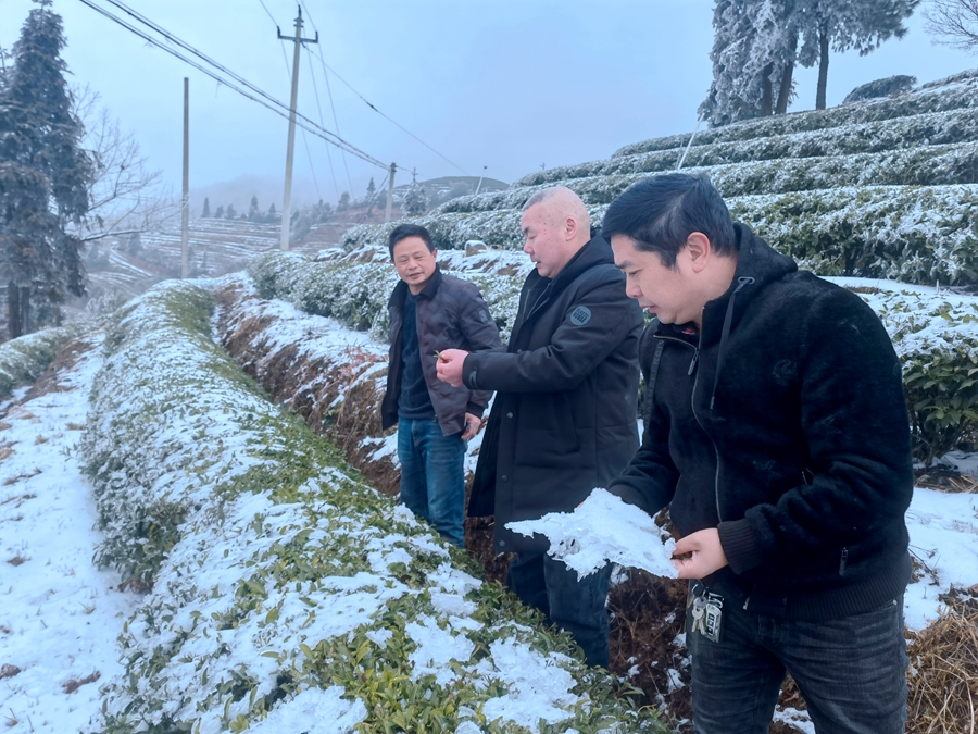 南平市科技特派員、浦城縣古樓鄉(xiāng)鄉(xiāng)村振興發(fā)展中心干部吳明建(圖中)正在指導(dǎo)茶農(nóng)防寒抗凍,茶園里積雪還未完全融化。 東南網(wǎng)2月25日訊(通訊員 吳勇君)“雪后氣溫回升,要及時(shí)人工清雪,減輕積雪融化引起的低溫對(duì)茶樹的傷害。在氣溫回升后新梢萌發(fā)前,視受凍輕重采用不同程度的修剪。將凍死的嫩芽與枝梢剪去,刺激剪口以下芽葉提前萌發(fā)。受凍茶樹在修剪后,有旱情的應(yīng)及時(shí)灌溉,并結(jié)合淺耕追施速效肥料,并配施一定量的磷、鉀肥;茶樹受凍后更容易誘發(fā)多種病蟲害,要加強(qiáng)茶樹病蟲害的預(yù)警……”