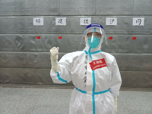 有一次,當(dāng)我剛剛把血壓計(jì)還回22區(qū)時(shí),一位阿姨過來說:護(hù)士,我感覺心慌、害怕,你可以幫我量下血壓?jiǎn)??我重新取回血壓?jì)給她測(cè)量,又幫她測(cè)了指脈氧,并安慰她:阿姨,不要害怕,您的各項(xiàng)生命指征都是正常的,安心住著,這里有這么多人,有什么不舒服或者有什么需求都可以過來跟我們說。她感激地笑笑,回我說:感覺好多了。這些看似簡(jiǎn)單的操作,其實(shí)對(duì)于穿著笨重的防護(hù)服又要時(shí)刻做好自我防護(hù)的我們來說,都是極其不易的,但為了病人,我們總是克服重重困難,耐心細(xì)致地做好服務(wù)工作。 巡視核對(duì)病人信息的時(shí)候,有位阿姨叫住我:小護(hù)士,你衣服上寫的是你的名字嗎?我回身回答她:是的。阿姨說:我有個(gè)孫女跟你一樣的名字。我笑著回她:真的嗎?好有緣分哦。我這個(gè)名字很大眾,很多人都叫這個(gè)名字。(確實(shí),在艙里上班已經(jīng)三次聽到有人說和我同名字的事了)轉(zhuǎn)身的時(shí)候:聽到她同另一位阿姨說,這個(gè)護(hù)士很有親和力,看起來就很好。嘿嘿,這是我今天收到的最好的禮物了吧。這種感覺,做護(hù)士的人都懂哈。第二天上班的時(shí)候,我在護(hù)理站正忙著,這位阿姨走過來很親切的和我打招呼:你今天上班啦?我開始沒太記起來,過后才反應(yīng)過來。此后幾天的班,只要遇到這位阿姨,她都很熱情的同我打招呼。她還告訴我,她也姓王,他老公也姓王。我也很熱情的跟她說:真是很有緣份,我們?nèi)倌昵斑€是一家人呢。 進(jìn)艙的每一天都是“痛,并快樂著”。盡管防護(hù)服里早已因?yàn)槊β刀M了汗水。 不知不覺,援滬已接近尾聲,回想這44天來的歷程,有辛苦,但更有收獲。這是我平凡的人生中一次不平凡的經(jīng)歷,一路行來,終無悔。正所謂,艱難困苦,玉汝于成,歷遍滄桑,人間值得。(王麗霞) |