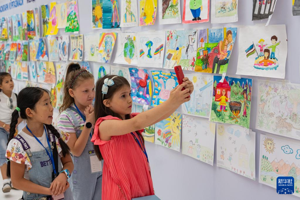 5月30日,小朋友在烏茲別克斯坦首都塔什干觀看“六一”兒童繪畫展。 當日,以“地球和平在我們手中”為主題的“六一”兒童繪畫展在烏茲別克斯坦首都塔什干的青年創意宮開幕。此次畫展征集展出烏茲別克斯坦兒童的畫作百余幅,開幕當天吸引眾多民眾前來參觀。 新華社記者 蔡國棟 攝