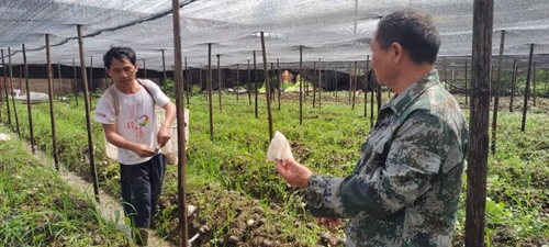 指導(dǎo)農(nóng)戶防治病蟲害 “洪水之后,吳站長及時指導(dǎo)我們?yōu)暮笤趺醋觯贾玫煤芮宄瑢謴?fù)竹蓀生產(chǎn)的田間清溝排水、防治病蟲害及竹蓀的烘烤技術(shù),他都做了技術(shù)指導(dǎo),講得非常詳細(xì)。”濠村鄉(xiāng)濠村村貧困戶陳軍說。
