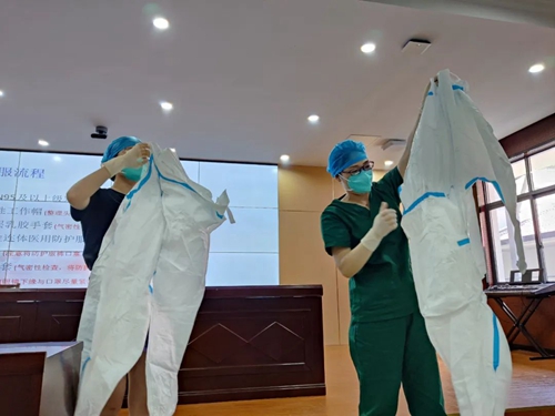 老師正在演示防護服的穿著 “我學習到了很多語言、禮儀方面的知識,這些知識不僅可以用到接下來的省運會的志愿服務中,而且還可以用到之后的生活和工作中都是非常不錯的,我會在家勤加練習,將它融入到我的志愿服務中,爭取給大家帶來更好的志愿服務。”省運會青年志愿者葉佳婧說。