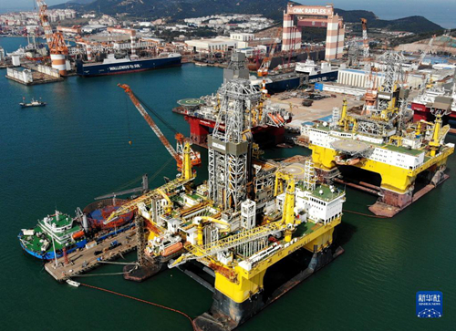 這是“藍鯨1號”(前右)及姊妹平臺“藍鯨2號”(前左)在其生產基地中集來福士海洋工程有限公司煙臺基地進行維護和保養(2021年10月18日攝,無人機照片)。新華社記者 李紫恒 攝 發展格局持續刷新。“推動海洋強省建設”是習近平總書記2018年6月在山東考察時作出的部署。山東沿著習近平總書記指引的方向,陸海統籌、向海圖強。建成海洋船舶、海洋重工、海洋石油裝備三大海工裝備制造基地;自主設計研發的“藍鯨1號”“藍鯨2號”鉆井平臺赴南海試采可燃冰……2021年,山東海洋生產總值14942.1億元,占全國海洋生產總值的16.5%。