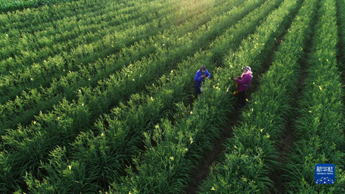 農(nóng)戶在寧夏吳忠市紅寺堡區(qū)柳泉鄉(xiāng)黃花菜基地采摘黃花菜(2022年7月5日攝,無人機(jī)照片)。新華社記者 王鵬 攝 黨的十八大以來,寧夏把打贏脫貧攻堅戰(zhàn)作為頭等大事,對標(biāo)“兩不愁三保障”,瞄準(zhǔn)突出問題和薄弱環(huán)節(jié),盡銳出戰(zhàn),80.3萬貧困人口全部脫貧,9個貧困縣全部摘帽,西海固于2020年11月徹底甩掉了絕對貧困的“帽子”。 數(shù)據(jù)顯示,10年間,寧夏農(nóng)民收入增長2.26倍、達(dá)到15337元,城鎮(zhèn)居民收入增長1.96倍、達(dá)到38291元,貧困地區(qū)群眾收入增長2.63倍、達(dá)到12786元。居民收入增速高于經(jīng)濟(jì)增速,農(nóng)民收入增速高于城鎮(zhèn)居民收入增速,脫貧群眾收入增速高于全區(qū)農(nóng)民收入增速,這三個“高于”成為寧夏扎實(shí)推進(jìn)全面脫貧與鄉(xiāng)村振興戰(zhàn)略有效銜接的底氣所在。