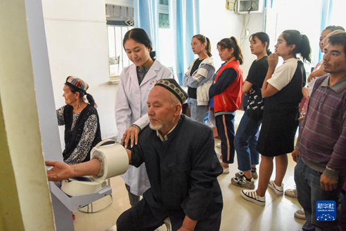 在新疆和田市伊里其鄉中心衛生院,居民接受免費健康體檢(2019年8月23日攝)。新華社記者 丁磊 攝 新疆堅持把本級財政支出70%以上用于保障改善民生,教育、住房、醫療等方面不斷取得新進展。10年來,新疆全面建成覆蓋全學段學生資助政策體系,沒有因貧失學輟學的孩子,城鄉義務教育一體化發展邁上新臺階。農村安居工程持續推進,新疆徹底結束了農村貧困人口住危房的歷史,近500萬農牧民住進安居房。“醫療惠民”政策落到實處,2016年起新疆每年堅持開展全民免費健康體檢工作,建起了慢性病、傳染病、地方病的防線,構筑起“健康新疆”的基石。