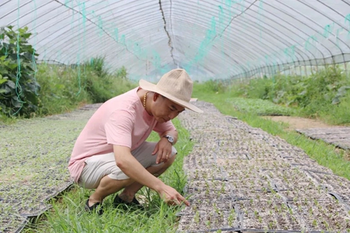 鄧韓斌察看育苗情況 “萵苣、空心菜喜陰,不需要太多的光照;番茄、黃瓜喜陽,可以種在光照較強的地方……”鄧韓斌是這個蔬菜種植基地的主人,說起種菜經驗,他頭頭是道。從小在農村長大的他,對土地有種特殊感情,小時候,他喜歡在自家的房前屋后種玉米、地瓜等,看到自己種的作物結出果實,總是特別開心。長大后,他又將目光投向了農業,嘗試高山蔬菜種植,并在家鄉創建起浦城群利種養殖合作社蔬菜基地。 “我一直看好農業,民以食為天,不管是誰都離不開一日三餐,糧食和蔬菜是必不可少的消費,做好農業,肯定有不錯的前景。”作為“80后”的鄧韓斌,眼光看得很遠。2018年,他在九牧鎮黃畢村流轉了80畝土地種植茄子、辣椒等高山蔬菜,本想可以從中掘取自己創業的“第一桶金”。但因技術不過硬,導致產量極低,不但沒有掘到“金”,還虧損十幾萬元。 做農業,首先得懂農業技術。鄧韓斌很快意識到這一點。2018年冬天,他在網上找到“潭州農業學院”的精品課,一口氣報了十多名蔬菜種植技術課程。這個冬天,他每晚學到深夜。“紙上得來終覺淺”,有了理論的支撐,求知心切的他決定到一些大型種植基地去實地觀摩學習。這一年,他先后來到武夷山、建甌、光澤等地的蔬菜種植基地,虛心討教種植經驗。