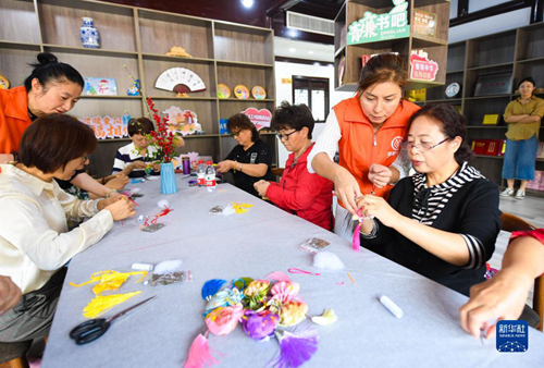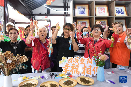 9月29日,在愛山街道衣裳街社區,“幸福鄰里”志愿者和老年居民共同制作茱萸香囊。 重陽節前夕,浙江省湖州市吳興區愛山街道開展系列主題活動,弘揚傳統民俗文化,倡導尊老、敬老、愛老的傳統美德。 新華社記者 翁忻旸 攝