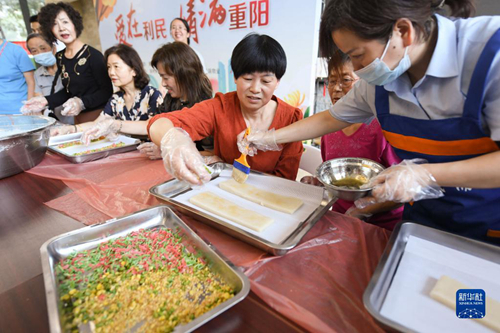 9月29日,在愛山街道利民社區,一家老字號企業的工作人員指導老年居民制作“重陽糕”。 重陽節前夕,浙江省湖州市吳興區愛山街道開展系列主題活動,弘揚傳統民俗文化,倡導尊老、敬老、愛老的傳統美德。 新華社記者 翁忻旸 攝