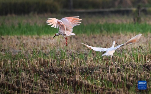 兩只朱鹮在陜西省洋縣謝村鎮一片收割后的稻田里嬉戲(2022年9月22日攝)。新華社記者 陶明 攝 “朱鹮曾廣泛分布于俄羅斯遠東、朝鮮半島、日本和中國一些地區。20世紀中葉以來,朱鹮棲息地面積不斷縮小,種群數量銳減。人們曾普遍認為,野生朱鹮已經滅絕。”??藙僬f道。 “不過令人欣慰的是,我國現在朱鹮的數量已經有7000余只了?!迸?藙傩χf,“今年,這里共誕下48只朱鹮幼鳥,為歷年來最多。” 在被稻田環抱的陜西朱鹮人工繁育中心,記者看到優雅高潔的朱鹮在寬大的網籠里振翅歡叫,飼養室中幾只在野外受傷被送來的朱鹮,正在工作人員的悉心呵護下康復。