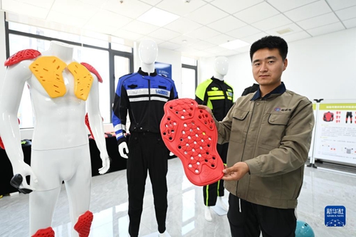 在位于秦創原總窗口所在地陜西省西咸新區的陜西拓銳考新材料科技有限公司,工作人員展示自主研發的納米智能吸能慢回彈護具(2022年6月17日攝)。新華社記者 李一博 攝 “公司的名字借用兵馬俑的英文,來彰顯陜西人銳意進取、只爭朝夕的‘擰勁兒’。”張彥峰介紹,拓銳考的發展歷程,是陜西抓好要素投入和服務保障,發掘培育一批創新力強、成長性高的科技制造業企業的縮影?!拔疑磉呍絹碓蕉喔咝=處熤鲃訁⑴c創新鏈與產業鏈的深度融合,為國家的產業轉型升級貢獻力量。”他說。