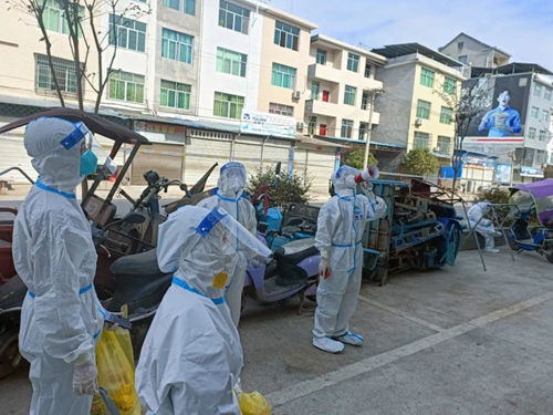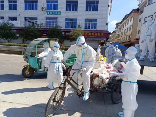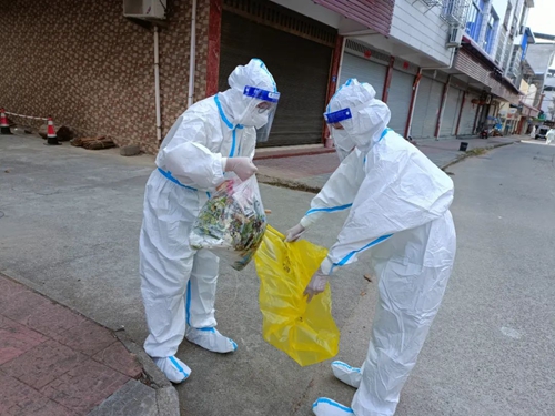 ▲上門收垃圾 封控11單元志愿者吳敏軍告訴我們 10月29日,為片區(qū)配送物資時 他蹬上了久違的人力小三輪 但穿著防護(hù)服大汗淋漓的樣子 還是頭一遭 由于一些區(qū)域通行不便 不得不用雙腿走完這“最后100米” 盡管如此他沒有放慢腳步 他說 一戶村民收到了物資后 遠(yuǎn)遠(yuǎn)地給他豎起大拇指 一身的疲憊突然間一掃而空……