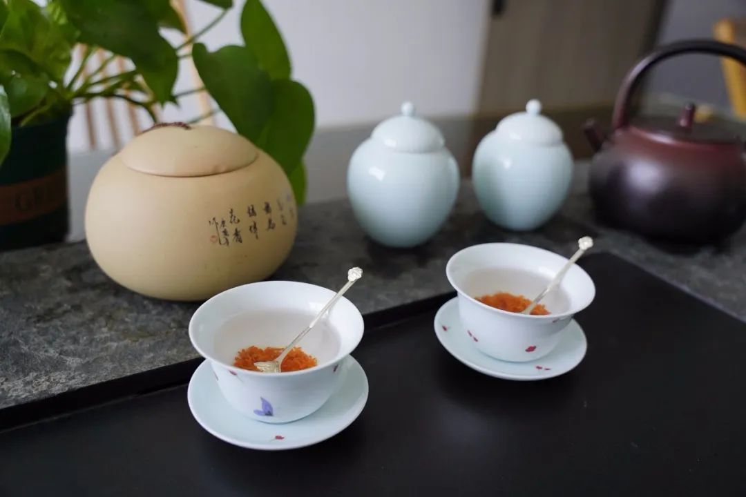 浦城木樨茶(柳浪漫 攝) 其次,浦城人對和木樨茶極為講究。 茶盅、茶盤選用青花瓷,攪拌茶蕊用白銀小匙,是銀匠精心打制的。家境優(yōu)越講究的人家,匙面雕刻龍鳳與梅花等圖案,并在銀匙手柄處鑲嵌一粒翡翠。延續(xù)至今,更多的是用浦城特有的青白瓷茶盅,也有用玻璃小杯。