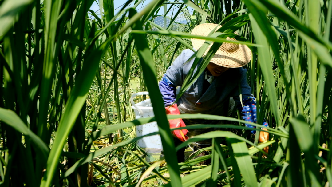 眼下正值茭白采收旺季。5月9日,記者在盤亭鄉棠嶺村的一片茭白種植基地里看到,農民們正拿著彎刀穿梭其間,熟練地收割一節節鮮嫩成熟的茭白,伴隨著一聲聲“咔唰”的脆響,豐收的喜悅在這片“綠海”中蕩漾開來。