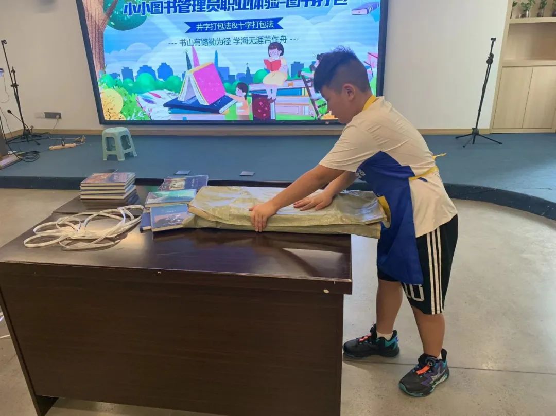 分組設(shè)計(jì)搭建圖書造型 第一天,老師帶領(lǐng)小管理員們觀看新華書店宣傳片、熟悉書城圖書區(qū)域、學(xué)習(xí)圖書堆碼和圖書管理,了解新華書店的歷史,感受新華人的艱苦創(chuàng)業(yè)的精神;走進(jìn)書城,詳細(xì)了解賣場圖書的分布、分類情況;學(xué)習(xí)圖書堆碼,小管理員們分組設(shè)計(jì)搭建圖書造型,了解圖書收發(fā)中的進(jìn)、銷、存、退是如何開展的,并動(dòng)手實(shí)踐給圖書上架。 第二天,教小管理員們學(xué)習(xí)如何打包圖書,學(xué)習(xí)了十字打包法、井字打包法等打包技能,告訴大家在日常生活中的使用場景;下午開展靜讀活動(dòng),讓每位小朋友自選一本“暑假讀一本好書”靜讀一小時(shí),并上臺(tái)分享各自的閱讀心得。