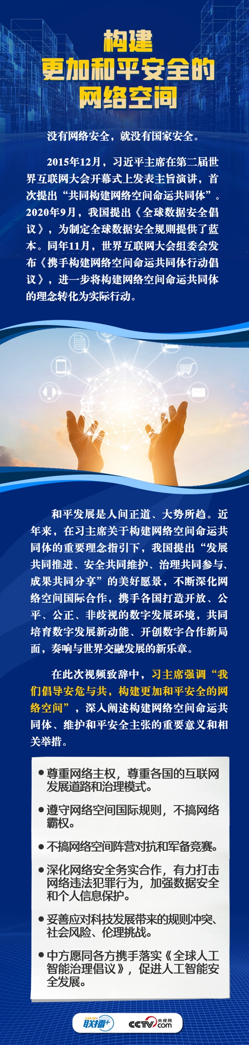 11月8日上午,國家主席習近平向2023年世界互聯網大會烏鎮峰會開幕式發表視頻致辭。 面對新的時代課題,習主席在此次視頻致辭中倡導構建更加普惠繁榮、更加和平安全、更加平等包容的網絡空間。這三個“網絡空間”具體內容是什么?構建網絡“新空間”有什么具體措施?央視網《聯播+》與您一同學習。
