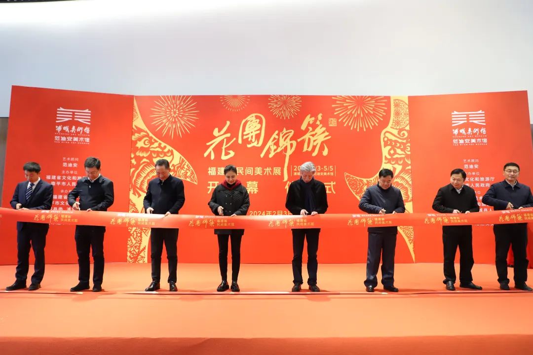 2月3日,“花團錦簇——福建省民間美術展”在浦城美術館/范迪安美術館開幕。中國美術家協會主席、中央美術學院原院長范迪安,中國工程院院士、福州大學黨委副書記、校長吳明紅,省文聯主席陸開錦,省委宣傳部副部長劉偉澤,省文旅廳副廳長吳新斌,市委常委、宣傳部部長李琦,市政府副市長林湫,縣領導沈曉文、李江平、楊文龍、鄭輝,省、市相關部門負責人和美術界嘉賓、書法名家等出席活動。