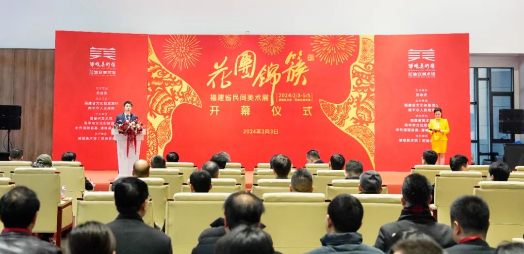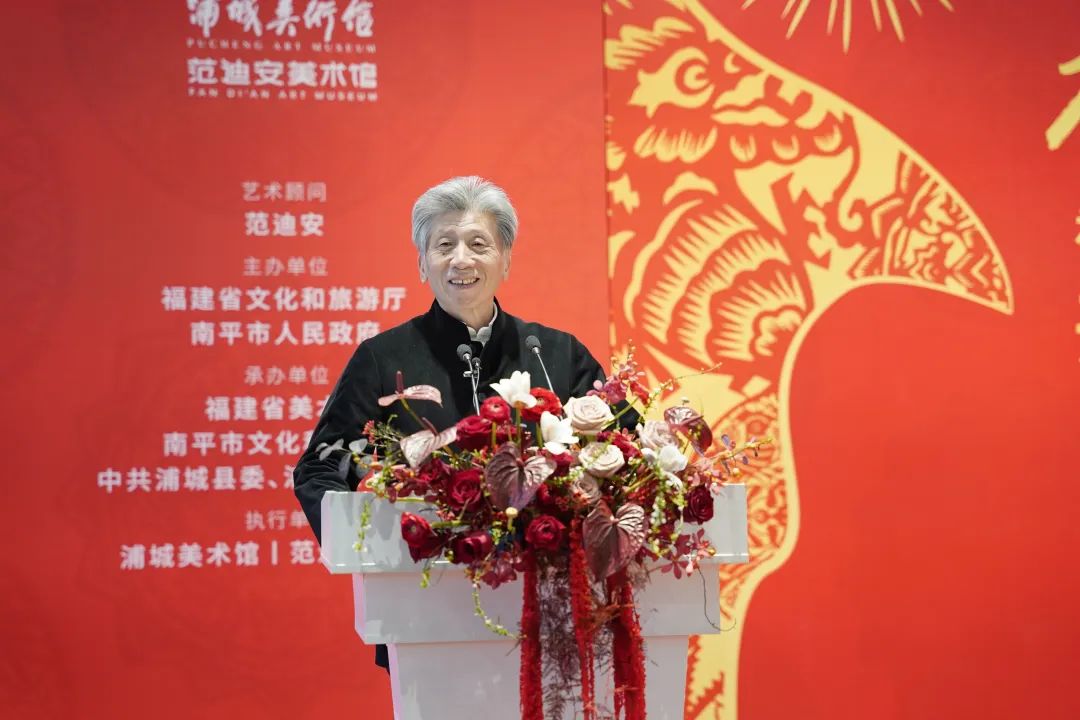 中國美術家協會主席范迪安在致辭中表示,浦城美術館/范迪安美術館自開館以來,深入貫徹落實習近平文化思想,堅持以文化人、以文惠民、以文潤城、以文興業,受到各方面領導和人民群眾的廣泛支持。感謝各級領導干部的關心關愛及各位藝術名家的無私捐贈,大家得以在一個小小的山城里就能看到全國美術的發展和許多名家的手筆。我們在龍年新春來臨之際,以福建民間美術展作為賀歲展,把福建各地的非遺文化、傳統文化、民間美術更多地推向社會,著力打造更加鮮明的福建文化品牌。浦城美術館/范迪安美術館將推出更多優秀美術展覽,更好滿足人民文化需求、增強人民精神力量,努力打造成為人民群眾欣賞美術佳作、提升文化素養的藝術殿堂。 省文旅廳副廳長吳新斌在致辭中指出,此次展覽匯集了福建各地眾多優秀的民間美術作品,題材廣泛、形式多樣、風格各異,充分展現了福建民間美術的傳統底蘊和創新精神。下一步,我們將努力做好八閩文化保護、傳承、傳播、發展“四篇文章”,堅定文化自信,守護好歷史文脈,進一步打響閩派特色文藝品牌,健全現代公共文化服務體系,以文化創新、賦能鄉村振興,更好滿足人民群眾日益增長的精神文化需求,攜手共進,熱忱投身民間美術的保護和傳承,讓這筆寶貴的文化遺產煥發出耀眼奪目的時代光彩。 南平市政府副市長林湫在致辭中指出,近年來,南平牢記囑托、感恩奮進,成功創建省級朱子文化生態保護區,進京展演《大儒朱熹》等,扎實推動優秀傳統文化創造性轉化、創新性發展。“花團錦簇——福建省民間美術展”開幕,為大家搭建了一個連接民藝與尋根情感的平臺,進一步激發廣大群眾對民間藝術的熱愛,讓更多的民間藝術作品走出南平,走出福建,走出中國。同時,南平將以此次活動為契機,深入挖掘文化旅游資源,積極構建“大武夷文化旅游圈”,奮力打造世界級旅游目的地和福建會客廳。 中國文化產業促進會公共藝術委員會藝術顧問章華表示,本次展覽以花團錦簇為主題,通過豐富多樣的民間美術作品,展現了福建省民間美術的獨特魅力。這些作品不僅是福建民間文化的瑰寶,更是中華民族文化傳承的重要組成部分。浦城美術館/范迪安美術館所珍藏的精品佳作,更是體現了深入學習和貫徹習近平文化思想,實現藝術生產和創造性轉化、創新性的發展的典范。 浦城縣委書記沈曉文在致辭中表示,浦城美術館/范迪安美術館建成開館,浦城剪紙元素在茶空間、數字影視等領域廣泛運用,青白瓷文化產業園建成開園,浦城獨特的民間文化資源在新時代正在綻放新的光彩,文化事業、文化產業邁上了新的臺階。浦城將以此次盛會為契機,進一步挖掘深厚的文化底蘊,實施優秀傳統文化傳承發展工程,向外傳播好浦城文化,講好浦城故事,大力發展文化事業,進一步擦亮文化這一“燙金名片”。 浦城剪紙傳承人吳洵作為藝術家代表致辭,他表示,浦城美術館/范迪安美術館為藝術家們提供了一個展示才華、交流競技的平臺,今后將牢記習近平總書記的殷殷囑托,在文化大發展大繁榮的格局下,創作出更多更好的作品。