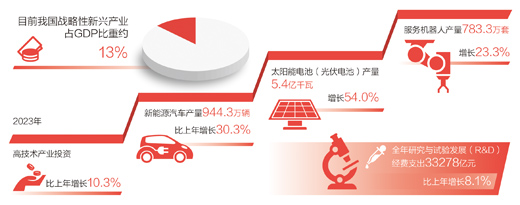 數據來源:工業和信息化部、國家統計局 習近平總書記強調:“發展新質生產力是推動高質量發展的內在要求和重要著力點,必須繼續做好創新這篇大文章,推動新質生產力加快發展”“整合科技創新資源,引領發展戰略性新興產業和未來產業,加快形成新質生產力”。 今年以來,各地區各部門在發展新質生產力上勇爭先、善作為、謀新策、出實招。代表委員表示,新時代新征程,要大力發展新能源、新材料、先進制造、電子信息等戰略性新興產業,積極培育未來產業,加快形成新質生產力,增強高質量發展新動能。 新質生產力是符合新發展理念的先進生產力質態 習近平總書記強調:“新質生產力是創新起主導作用,擺脫傳統經濟增長方式、生產力發展路徑,具有高科技、高效能、高質量特征,符合新發展理念的先進生產力質態”。 代表委員表示,新質生產力已經在實踐中形成并展示出對高質量發展的強勁推動力、支撐力。加快發展新質生產力,有利于建設現代化產業體系。 “新質生產力特點是創新,關鍵在質優,本質是先進生產力,對于加快建設現代化產業體系具有重要意義。”通用技術集團黨組書記、董事長于旭波代表說,通用技術集團與重慶理工大學共同推進納米時柵技術產業化,廣泛應用于高檔數控機床、機器人領域,助力國內高端裝備產業發展。 中國科學院院士趙宇亮委員表示,加快發展新質生產力,有利于建設具有完整性、先進性、安全性的現代化產業體系。 加快形成新質生產力,打造經濟增長新引擎。2023年,我國新能源汽車產量達944.3萬輛,比上年增長30.3%;太陽能電池(光伏電池)產量達5.4億千瓦,增長54.0%;服務機器人產量783.3萬套,增長23.3%。 “發展新質生產力,既有利于培育發展一批產業規模大、帶動能力強的支柱產業,也有利于加快傳統產業轉型升級,增強我國經濟發展韌性,推動經濟實現質的有效提升和量的合理增長。”中山大學黨委副書記、校長高松代表說。2023年,我國高技術制造業增加值增長2.7%,高技術產業投資比上年增長10.3%,新動能不斷積蓄。 中國鐵道建筑集團有限公司黨委書記、董事長戴和根委員表示,新質生產力由技術革命性突破、生產要素創新性配置、產業深度轉型升級而催生,以勞動者、勞動資料、勞動對象及其優化組合的躍升為基本內涵,以全要素生產率大幅提升為核心標志。 加快形成新質生產力,有利于塑造國際競爭新優勢。 “當前,新一輪科技革命和產業變革深入發展,科技創新是重中之重。”中國工程院院士、鵬城實驗室主任高文代表說,哪個國家擁有先進科學技術,擁有處于世界領先地位的戰略性新興產業和未來產業,哪個國家就更有可能贏得發展主動權。 高松代表表示,中國式現代化關鍵在科技現代化,要把握好新一輪科技革命和產業變革帶來的巨大機遇,加快形成新質生產力,打造新優勢。 科技創新是發展新質生產力的核心要素 習近平總書記指出:“科技創新能夠催生新產業、新模式、新動能,是發展新質生產力的核心要素。” 代表委員表示,必須加強科技創新特別是原創性、顛覆性科技創新,加快實現高水平科技自立自強,打好關鍵核心技術攻堅戰,培育發展新質生產力的新動能。 加快原創性、顛覆性科技創新,培育發展新質生產力的強勁動能。 “發展新質生產力,需要依靠‘從0到1’的科技創新,通過原創性、顛覆性、前沿性的技術突破,打造高質量發展的動力引擎。”于旭波代表說,2023年,我國全年研究與試驗發展(R&D)經費支出33278億元,比上年增長8.1%。中央企業要進一步發揮創新主體作用,營造積極進取的科技創新環境,鼓勵更多原創性、顛覆性科技創新。 “新一代人工智能、生命科學等新技術快速發展,將加速重塑全球產業鏈供應鏈格局,深刻改變世界各國的比較優勢和競爭優勢。”高松代表表示,應該瞄準世界科技前沿,真正把論文寫在祖國大地上,把科技成果應用在推動高質量發展中。 深化體制機制改革,打通束縛新質生產力發展的堵點卡點。 “發展新質生產力,必須進一步全面深化改革,形成與之相適應的新型生產關系。”趙宇亮委員說,要充分發揮科技創新成果產業化平臺的引領作用,加強科技創新成果的產業化轉化,將科技創新成果轉化為新質生產力。 國機重型裝備集團股份有限公司黨委書記、董事長韓曉軍代表建議,要通過優化重大技術裝備首臺套及首批次材料研制支持政策,支持行業頭部企業搭建中試平臺,創新生產要素配置方式,讓各類先進優質生產要素向發展新質生產力順暢流動。 打造新型勞動者隊伍,夯實發展新質生產力的人才基礎。 “加快發展新質生產力,應著力夯實人才基礎,拿出真金白銀、真招實策、真心實意,引才聚才用才留才。”內蒙古自治區鄂爾多斯市委副書記、市長杜匯良代表介紹,2023年,鄂爾多斯共引進兩院院士等高層次人才19名、博士碩士1291名。 “發展新質生產力,應通過壯大人才鏈、加強科技鏈、激活創新鏈、升級產業鏈來實現。”趙宇亮委員表示,我國人才資源總量、科技人力資源、研發人員總量均居全球首位,應進一步暢通教育、科技、人才的良性循環,完善人才培養、引進、使用、合理流動的工作機制。 聚焦關鍵環節扎實發展新質生產力 習近平總書記強調:“要及時將科技創新成果應用到具體產業和產業鏈上,改造提升傳統產業,培育壯大新興產業,布局