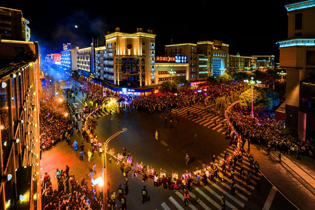 閩臺(tái)東石燈俗數(shù)宮燈活動(dòng)為期三天(正月十三至十五),每年正月十三開(kāi)始,在晉江市東石鎮(zhèn)和臺(tái)灣布袋鎮(zhèn)嘉應(yīng)廟(俗稱三公宮)同時(shí)舉行,由各戶頭(各角落)主事輪流執(zhí)掌主持。晉江東石掛宮燈時(shí),臺(tái)灣的東石鄉(xiāng)親于正月十三提前派人回鄉(xiāng)祭祀“三公爺”,同時(shí)帶來(lái)與過(guò)去一年內(nèi)臺(tái)灣鄉(xiāng)親新婚數(shù)相符的宮燈數(shù),再捎回故鄉(xiāng)的宮燈數(shù),兩地互報(bào)宮燈數(shù),共祝子孫興旺。這種世代相沿的元宵數(shù)燈習(xí)俗反映了兩岸東石人對(duì)家族興旺、子孫昌盛的熱切期盼,是中華民族文化凝聚力的生動(dòng)體現(xiàn)。 龍舞 (大田板燈龍) 大田板燈龍,福建省三明市大田縣傳統(tǒng)舞蹈。每年的元宵節(jié),大田人都要在鄉(xiāng)村或街巷舞動(dòng)板燈龍,俗稱為“迎龍”。