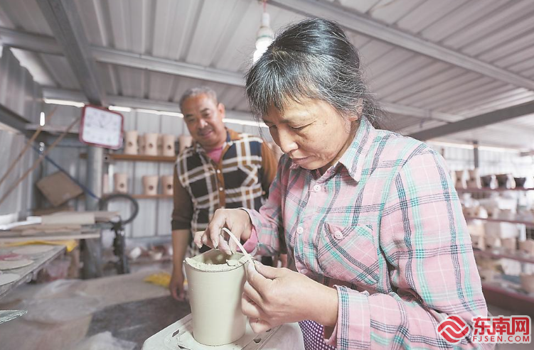 在許英森家里,有一架子的大壯爐,都是近幾年各地客戶訂購的樣品。 東南網3月24日報道(福建日報記者 王毅 通訊員 藍毅輝 文/圖) 喝茶之人常說:“茶必武夷,壺必孟臣,杯必若琛。”若是到了閩南和潮汕地區就得再加一句:“爐必大壯。” 這些沉淀著工匠精神的茶器,讓人們在品茗時獲得了物質和精神的雙重享受。 大壯爐形似元寶,高筒細腰,爐口翹起三片飛翼,飛翼結構可最大限度保證火苗與茶爐的接觸。 大壯爐的第一代創始人許大壯生活于清康熙年間南靖馬坪(今龍海程溪鎮人家村一帶),以制爐著名。據康熙《漳州府志》記載:“茶爐,出馬坪,以白土為之,其色如施粉,風口刻花,工致異常,前此未有也。” 漳州市龍海區程溪鎮人家村的許英森是漳州大壯爐傳統制作技藝第十二代傳承人。今年1月,他入選第五批龍海區區級非物質文化遺產代表性傳承人。 早在明末,大壯爐就被運至龍海海澄月港,再經大船漂洋過海,行銷全國乃至東南亞,尤其在清光緒年間,大壯爐銷往日本,大受歡迎。隨著電爐的出現,大壯爐的傳統制作技藝逐漸失傳。2014年,當日本客商尋找大壯爐聯系到許英森時,他發現手工炭爐的市場在慢慢復蘇,就算在本地也有不小的需求。 今年56歲的許英森自小跟著父親學習馬坪茶爐制作,他與妻子許珠珍將工作室安置在自家樓頂。根據記憶與實物,許英森在很短的時間里就復原了祖上大壯爐的制作技藝,“當時訂購的數量雖然不多,但手工制作花了好幾個月”。 “只要原料還在,我就能做出當年的大壯爐。”許英森告訴記者,人家村特有的高嶺土是大壯爐的配方關鍵,以此為原料搭配一定比例的砂泥,制作出的大壯爐經久耐用,經歷炭火高溫而不裂。 既然開爐,就不能只是做幾次買賣,要把技藝不斷傳承下去。在兒子許鳴山的幫助下,許英森開啟了關于大壯爐的網絡推廣賬號。 “沒想到很多人發私信問我,真的還有在制作這么傳統的炭爐嗎?”許英森搓著滿是泥灰的雙手憨笑著說,“很多年輕人下單購買,還有特意上門探訪拍攝的。” 在自家樓頂簡易的雨棚下,許英森和許珠珍一個人揉土,一個人修坯,邊上的電窯爐正燒制著四五個小號的大壯爐。在申報區級非遺成功后,許英森注冊了大壯爐商標,每一個親手制作的爐子上他都會打上印章,“現在村里還在做爐子的就我一家了,我力求將每一個爐子制成精品,讓每一個享受傳統炭爐煮茶樂趣的人滿意,也能對得起有幾百年歷史的馬坪茶爐口碑”。