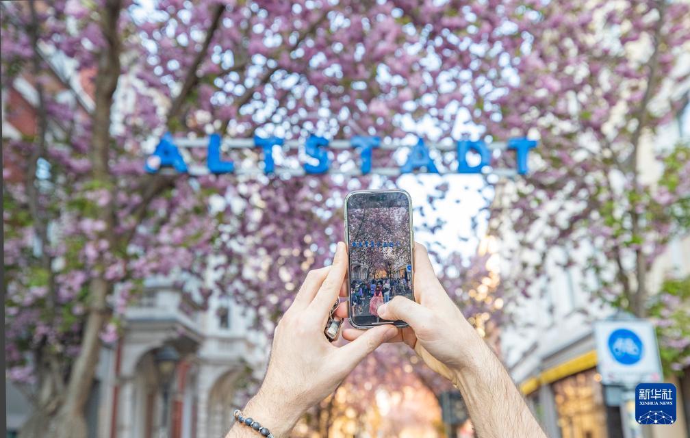 4月12日,游人在德國波恩拍攝盛開的櫻花。 新華社記者 張帆 攝