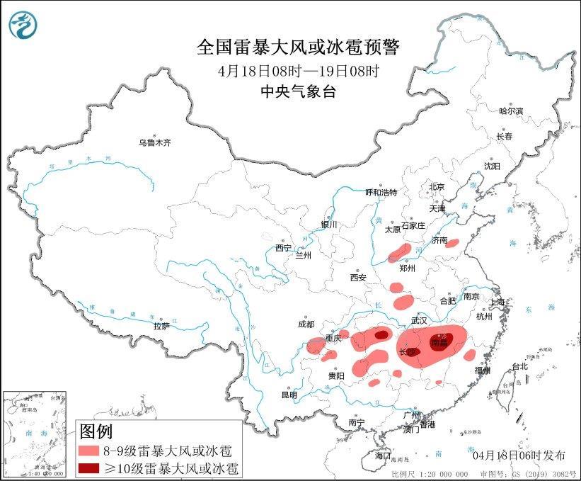 中央氣象臺4月18日06時發布強對流天氣藍色預警: 預計4月18日08時至19日08時,西南地區東部、江漢、江南以及河南西北部、山東南部等地的部分地區將有8級以上雷暴大風或冰雹天氣,其中,湖南中部和西北部、江西中北部等地的部分地區將有10級以上雷暴大風,最大風力可達11級以上;西南地區東部、江南等地的部分地區將有小時雨量大于20毫米的短時強降水天氣,其中,湖南中北部、江西中北部、貴州東南部等地的部分地區小時雨量大于50毫米,最大可達60毫米以上。 預計,強對流的主要影響時段為今天下午至夜間。