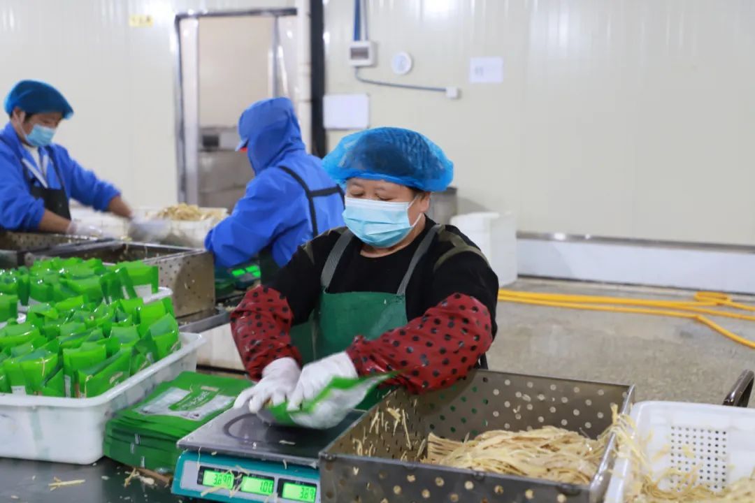 筍干包裝 小溪村通過“雙領辦”,激活了鄉村發展動能,凹后村,則通過“產業托管”的方式,為鄉村振興增添活力。2021年,在東部戰區海軍幫扶下,凹后村新建起筍片加工廠,隨即,引入浦城縣素冠食品有限公司發展生產。“山下筍干品質過硬,我們以筍干為原材料,結合市場需求,生產嫩紙片筍、嫩筍尾等近十種產品。去年,我們加工筍干產品100噸左右,年產值將近2000萬元。”該廠負責人李輝說,工廠加工所用的原材料筍干優先從當地收購,切筍、煮筍、消毒等車間也為當地村民提供了就近就業的崗位,每年大約發放工人工資約80萬元。據介紹,在該廠建設中,村集體投資了150余萬元,目前,按照“合作經營、保底收益”的原則,村財收入每年大約增收20萬元。 山下筍干制作技藝是南平市非物質文化遺產,保留住老手藝,亦是保留住好口碑。在王柏村,山下筍干制作技藝市級非遺傳承人李昌河正趁著鮮筍上市,利用傳統工藝制作明筍干、黑筍干等當地特色產品。這幾年,他也結合當下年輕人的喜好,將片狀筍干制作成方便食用的絲狀、塊狀干貨和脆筍片、即食熟筍干等產品,并注冊“王柏黑筍干”“翡翠記憶”等商標,年產銷各類筍干2萬多公斤,產值可達300余萬元,成為當地筍干產銷大戶。