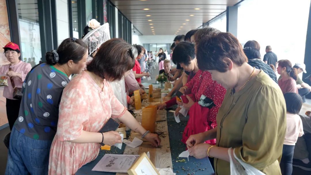 制作香囊 浦城美術館(范迪安美術館)門前人頭攢動。“浦城丹桂花茶展”茶香四溢,茶師們娓娓道來浦城茶文化的深厚底蘊。圍坐品鑒時,琥珀色的茶湯入口回甘,游客們在茶香氤氳中暢談交流,共享閑適時光。美術館外的空地上,套圈游戲引得陣陣歡呼。套圈拋出的弧線與歡笑聲交織成歡樂的海洋。在香囊制作區,工作人員指導游客將浦城茶葉、香料等精心縫制進香包……