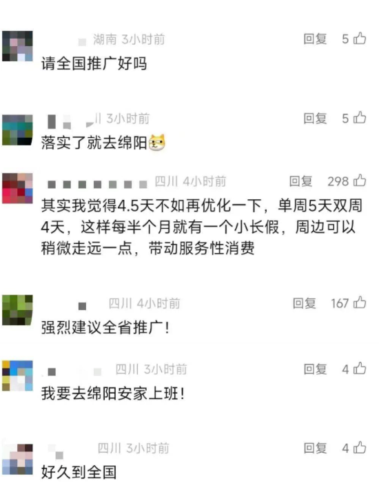 △《綿陽市提振消費專項行動2025年工作清單》 5月24日,記者致電綿陽市政府值班室,工作人員表示沒有接到相關(guān)通知。記者隨后聯(lián)系到綿陽市商務(wù)局,該局工作人員介紹,相關(guān)文件中寫的是鼓勵有條件的地區(qū)實行4.5天彈性工作制度,但并非強(qiáng)制要求。 對此,不少網(wǎng)友表示建議在全國推廣。