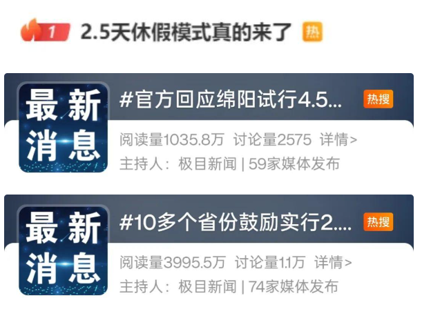 近日 四川綿陽宣布 試行4.5天彈性工作制 鼓勵2.5天休假模式 相關(guān)話題沖上社交平臺熱搜第一