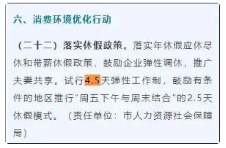 四川綿陽官宣試行4.5天彈性工作制 官方回應(yīng):并非強(qiáng)制 近日,四川省綿陽市商務(wù)局印發(fā)《綿陽市提振消費專項行動2025年工作清單》,旨在全面提升居民消費能力和市場活力。 《工作清單》提出開展七大核心行動,包含29條具體措施,涵蓋了收入、教育、養(yǎng)老、住房、賽事、夜經(jīng)濟(jì)、休假等多個方面。備受關(guān)注的落實休假政策中提到,落實年休假應(yīng)休盡休和帶薪休假政策,鼓勵企業(yè)彈性調(diào)休,推廣夫妻共享。試行4.5天彈性工作制,鼓勵有條件的地區(qū)推行“周五下午與周末結(jié)合”的2.5天休假模式。