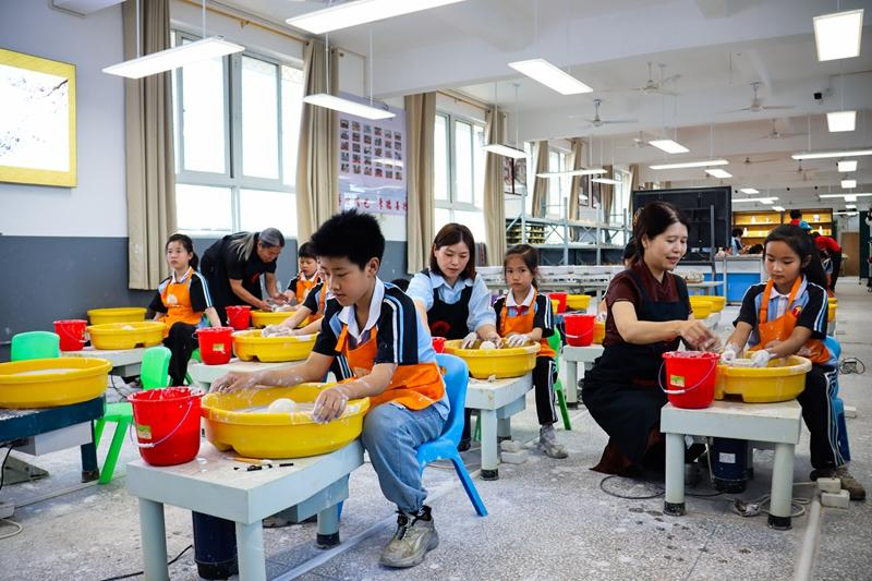 浦城縣實(shí)驗(yàn)小學(xué)邀請(qǐng)浦城大口窯青白瓷制作技藝代表性傳承人熊文慧、熊文杰團(tuán)隊(duì)定期授課。東南網(wǎng)記者 鄭正華/攝 “學(xué)校青白瓷社團(tuán)以‘瓷韻潤德,節(jié)氣育人’為宗旨,通過‘瓷土塑形、節(jié)氣賦魂、德行入心’三維育人模式,達(dá)成‘塑瓷器·冶情操·傳文明’的立體化育人目標(biāo)。”浦城縣實(shí)驗(yàn)小學(xué)校長黃豐雷說,學(xué)生在活動(dòng)中不僅掌握了陶藝技能,還提高了審美能力和文化素養(yǎng)。同時(shí),陶藝課程還激發(fā)了學(xué)生的學(xué)習(xí)興趣和創(chuàng)造力,促進(jìn)了他們的全面發(fā)展。 據(jù)介紹,該校采用“非遺傳承人+專業(yè)教師”雙師制,邀請(qǐng)浦城大口窯青白瓷制作技藝代表性傳承人熊文慧、熊文杰團(tuán)隊(duì)定期授課,確保技藝傳承的規(guī)范性。截至目前,每周參與學(xué)生300余人次,形成了濃厚的陶藝文化氛圍。 “我們用故事化教學(xué)引入青白瓷歷史,感受非遺魅力;通過分層教學(xué),讓每個(gè)孩子都能找到參與感、體驗(yàn)感和滿滿的成就感。”熊文慧在談到設(shè)計(jì)浦城大口窯青白瓷制作技藝課的核心思路時(shí)表示,課程設(shè)計(jì)以“從興趣啟蒙到深度體驗(yàn)”為邏輯,低齡段側(cè)重趣味互動(dòng),中高年級(jí)段主要是動(dòng)手能力、專注力、想象力的培養(yǎng)。 同時(shí),學(xué)校創(chuàng)新地將傳統(tǒng)技藝與現(xiàn)代科技結(jié)合,開發(fā)了圖文并茂的校本教材并制作了3D制瓷工藝動(dòng)畫。學(xué)生通過設(shè)計(jì)專屬瓷碗、杯子、花瓶,從拉坯、雕刻到燒制全程參與,最后用AR技術(shù)模擬窯變效果,幫助學(xué)生直觀理解陶藝,既傳承非遺,又培養(yǎng)了創(chuàng)新思維。