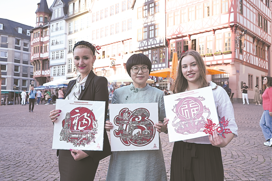 在德國法蘭克福羅馬廣場(chǎng),周冬梅(左)的剪紙頭花吸引外國友人試戴。 五六月的德國萊茵河畔風(fēng)光旖旎,浦城剪紙國家級(jí)非遺傳承人周冬梅手持剪刀,在紅紙間上下翻飛,當(dāng)她輕輕展開折疊的紅紙,一只喜鵲躍然梅梢之上,一件《喜上眉梢》就完成了。她還剪出一只只蝴蝶戒指、蝴蝶發(fā)夾,“飛”上外國友人的指尖、發(fā)梢。 “這次,我們受到福建省文旅部門的邀請(qǐng),隨團(tuán)到德國和烏茲別克斯坦參加活動(dòng),讓浦城剪紙這一傳統(tǒng)文化漂洋過海,傳遞東方之美。”6日,剛回國的周冬梅和記者說起這趟海外之旅,臉上還洋溢著幸福與自豪的笑容。 剪紙文化出海,少不了代表作剪福字。這次,周冬梅從《福建百福圖》中挑選了30多幅作品出國展示,并演示剪紙技藝。這些千姿百態(tài)、蘊(yùn)藏中華文化的傳統(tǒng)藝術(shù)作品,讓在場(chǎng)的外國觀眾驚嘆不已。 看外國人這么有興趣,作為傳承人的她也興致盎然,將剪紙技藝傾囊相授。