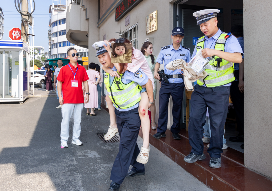 羅貞洪/攝 “來得及!你指路,我當你的拐杖。”6月7日上午8時35分,浦城二中考點一考生不慎摔倒,膝蓋和手受傷,不便行走。8時39分,經主考官同意后,執勤交警周建林背著考生經過安檢將其送入考場,一邊喘氣奔跑,一邊安撫著考生情緒。 “別擔心,有叔叔在”