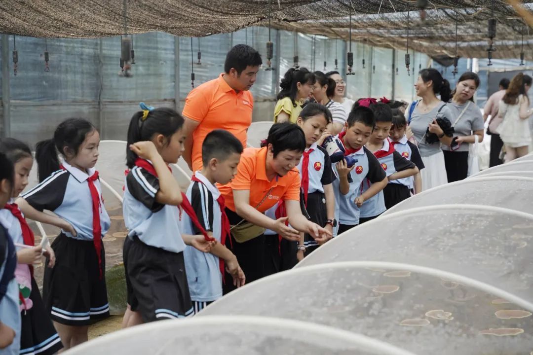 活動首站,大家來到靈芝種植試驗基地,赤芝、紫芝、韓芝等形態各異的靈芝深深吸引了孩子們的目光,孩子們湊近不同品種、處于不同生長期的靈芝,仔細觀察其模樣、紋理。工作人員耐心講解靈芝種植技術要點與注意事項,讓孩子們深刻體會到靈芝種植的艱辛與不易,在心里埋下尊重勞動的種子。 孩子們一邊認真聆聽,一邊詳細記錄,不時還提出“靈芝有媽媽嗎?”“靈芝需要多少天才能長大?”等充滿童趣的問題。