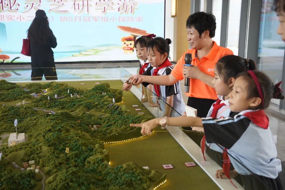參觀仙芝樓國際交流中心 隨后,大家走進仙芝樓國際交流中心,映入眼簾的就是靈芝基地的沙盤模型,工作人員通過沙盤模型,向師生家長與孩子們生動介紹了靈芝的生長環境與基地選址的嚴苛標準,紛紛感嘆道:“原來靈芝選擇住的地方要求這么嚴格?”在學術報告廳里,通過聽講靈芝科普講座和觀看靈芝科普視頻,讓大家穿越歷史,直觀了解靈芝從生長到發揮藥用價值的全過程,這種跨越千年的文化傳承,讓中醫藥智慧在孩子們心中生根發芽。