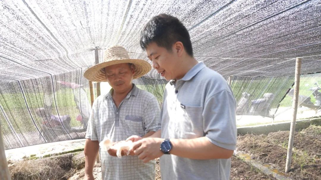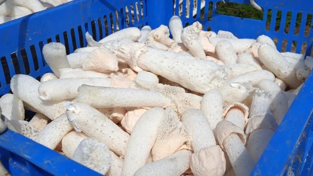 山后村駐村第一書記李柯楠與村民查看竹蓀長勢 “這竹蓀菌柄挺直、菌裙舒展,今年雨水足、管護細,一壟壟長得真旺實!”山后村駐村第一書記李柯楠捧著雪白的竹蓀說。他身處的竹蓀基地里,新冒出的菌蕾正頂著泥土舒展。 清晨6點至10點,是竹蓀采摘的“黃金窗口期”。村民們戴著手套的雙手在菌壟間穿梭如靈動的琴弦,指尖輕觸菌柄基部,手腕微旋,便將整株竹蓀連根帶土收入竹籃——這套經過百次練習的“采摘三重奏”,既能避免指紋損傷菌裙,又能完整保留菌托的營養價值。 竹蓀產業的興旺,實實在在地鼓了村民的腰包?!斑@段時間天天忙著采竹蓀,雖然辛苦,但是心里高興,不僅能掙錢,還能照顧家里?!辈烧と送兄鴦傉碌闹裆p笑著說。據統計,僅采摘季,種植基地就吸納周邊200余名村民務工,一天人均增收100余元。此外,竹蓀種植還帶動了菌種培育、有機肥料、物流運輸等上下游產業發展,形成了完整的產業鏈條。