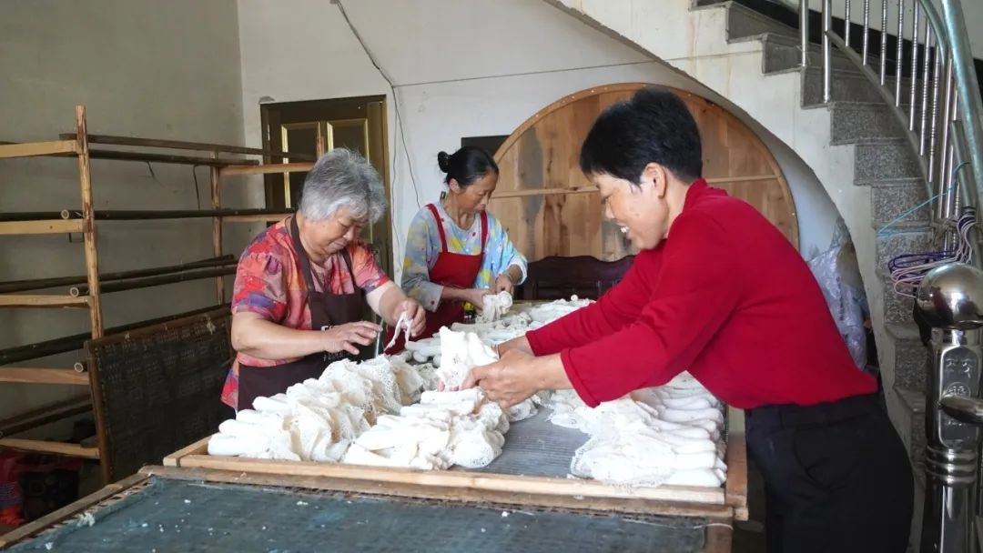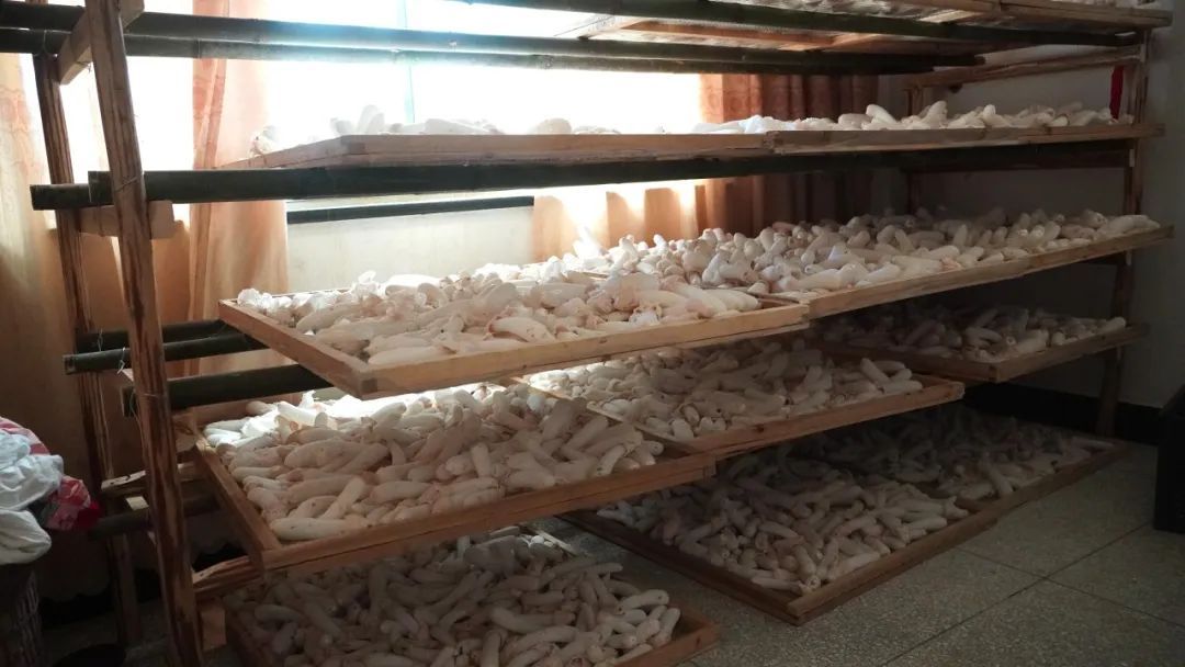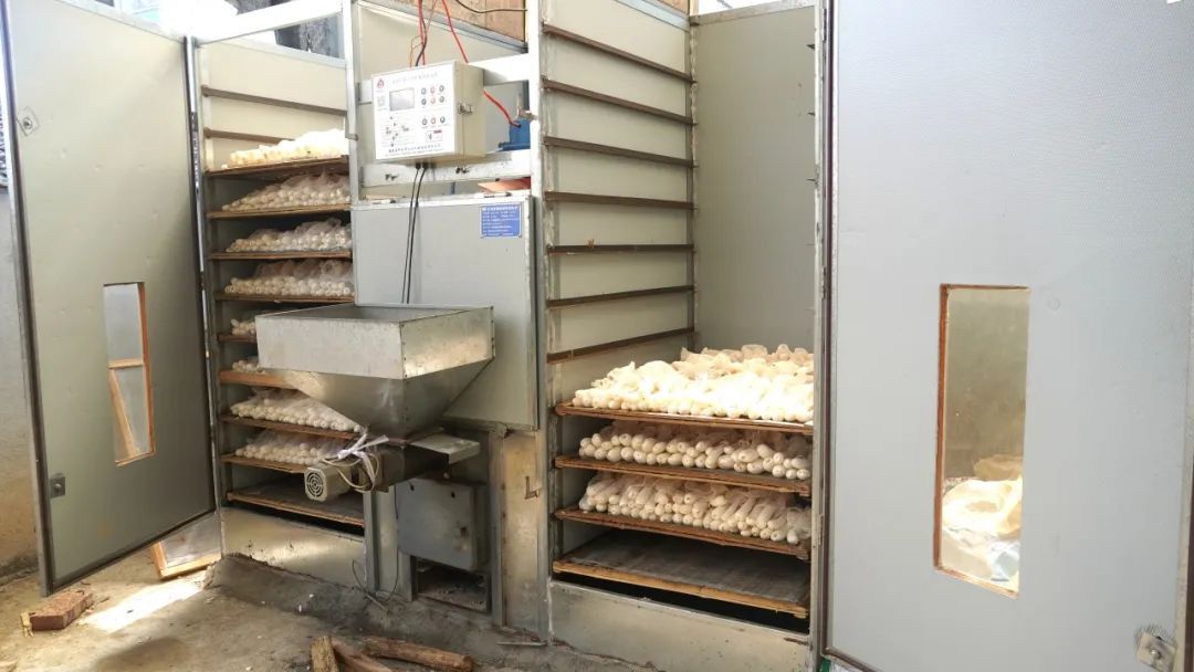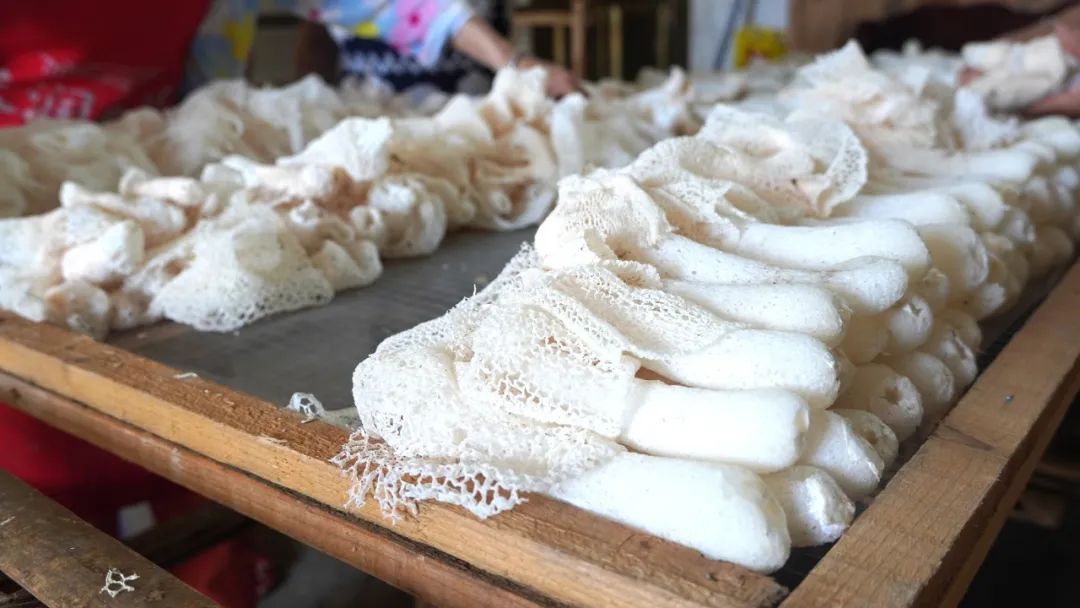 工人正進行分揀工作 近年來,臨江鎮積極探索多元化發展路徑,除了傳統的鮮品銷售,還建成了烘干間,開發出竹蓀干貨等產品。采摘下來的竹蓀被整齊擺放在烘干間的多層烘干架上,每一層都保持著均勻的間距,確保竹蓀受熱均勻。烘干后的竹蓀,不僅保留了原有的營養成分,還更便于儲存和運輸?!敖涍^烘烤的竹蓀,香氣更加濃郁,在市場上十分搶手?!惫と四闷鹨欢浜娓珊蟮闹裆p展示,原本蓬松的竹蓀變得緊實,菌裙依然舒展,泛著自然的米白色。 “今年山后村竹蓀畝產干貨可達180斤,市場價格約為每斤80元,預計今年竹蓀干貨總收入可達80萬元?!鄙胶蟠妩h支部書記周昌文介紹。