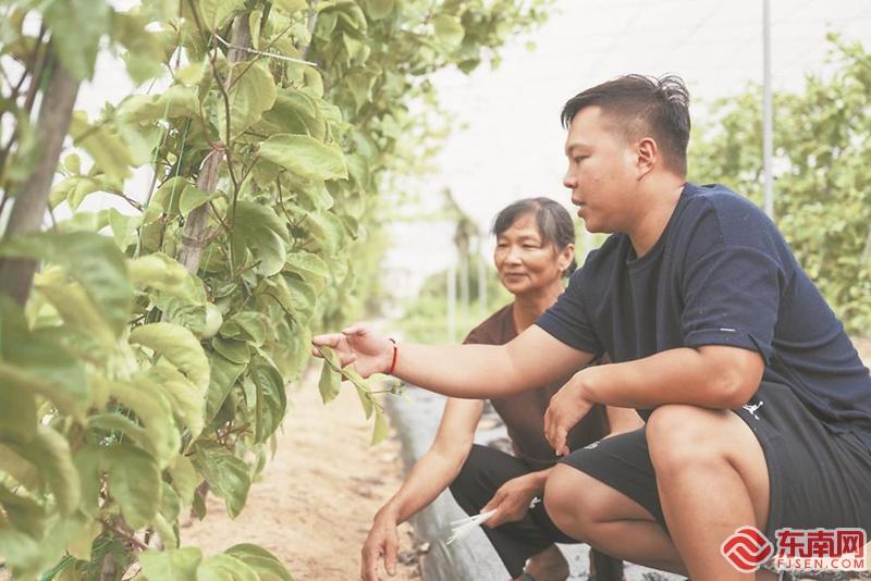 臺胞傅韜丞(右)與上樓村村民一起查看黃金百香果的長勢。通訊員 林君斌 攝