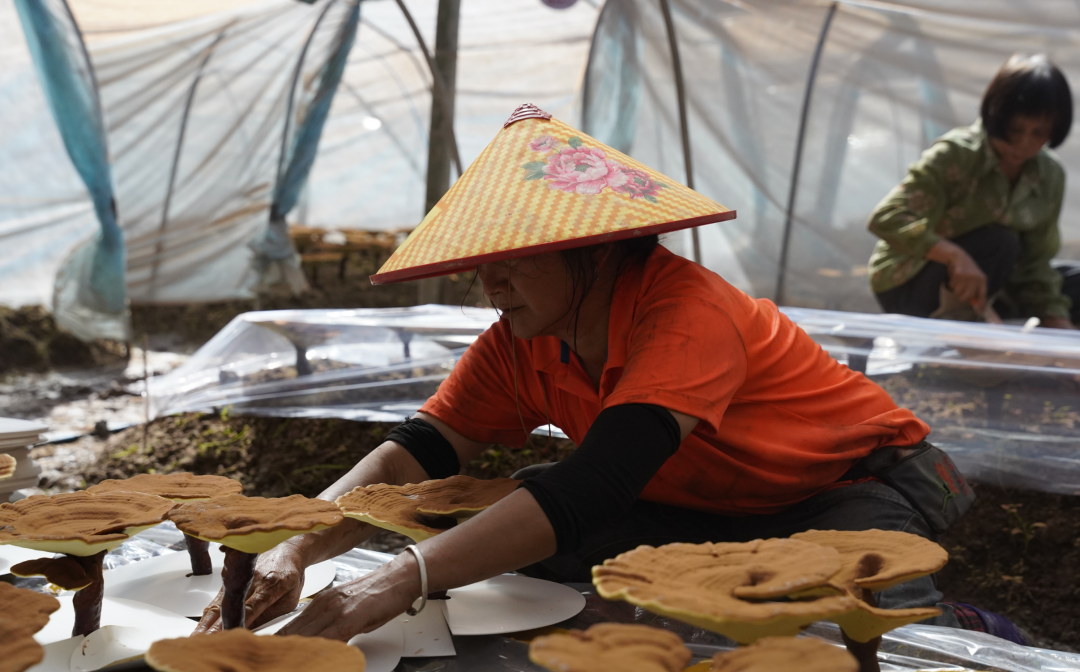 工人們正忙著給地面“貼膜” “我們堅持‘一棒一芝’精養模式,只挑選木段間隙中最茁壯的靈芝芽培育,我們覆蓋上地膜與托盤便于孢子粉的采收,也能避免靈芝受病蟲害影響。”仙芝科技(福建)股份有限公司基地部負責人劉國輝在棚內介紹,基地依據中、美、日、歐盟四重有機標準種植,靈芝在仿野生環境中循著節律生長,全過程零污染、可追溯。 “我們一般都以種田為主,閑暇的時候,就在基地這邊掙點錢,一年大概有一萬多元呢,平時有空就來這邊做事。”在基地干活的管厝鄉巖步村村民鄧麗平高興地說。 “有機靈芝的種植、管理和采收都是精細活,我們有很大用工需求,忙的時候基地每天需要20到30位村民做事。大家在家門口干活就有收入,愿意來也樂意來。”劉國輝說,目前,仙芝科技(福建)股份有限公司在浦城打造有機靈芝種植基地2000多畝,林下種植規模近3000畝,帶動周邊農戶1500多戶實現就業,每年促進村民村財增收5000萬到6000萬元。 有機靈芝種植模式,讓靈芝成為村民致富增收的“金傘傘”。據悉,仙芝科技不斷優化“企業+基地+農戶”模式,與合作社、村集體、種植大戶等簽訂種植合作協議,對合作主體實行“五個統一”,即統一提供菌種、統一技術培訓、統一過程管理、統一質量標準、統一市場保護價收購,促進靈芝產品的標準化和質量提升,拓展市場銷售渠道,確保農戶收益。據悉,近三年來累計培訓技術人員365人次、農民2600多人次,推廣靈芝種植1.5萬畝,帶動農戶種植近萬戶,促進10多個鄉鎮實現農民共富、村財增收。