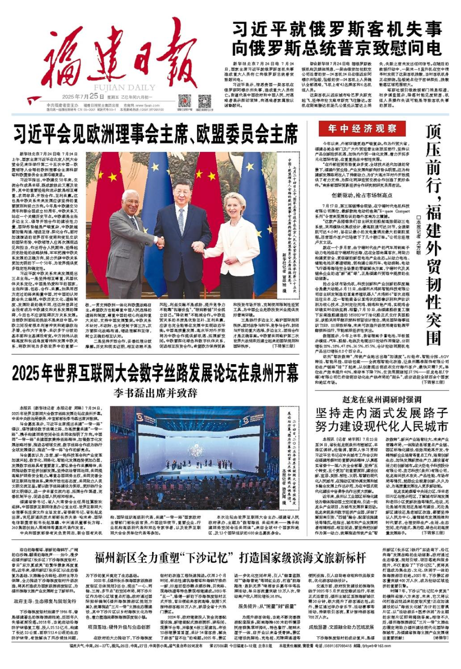2025年7月25日《福建日報》第01版 東南網7月25日訊(福建日報記者 尤方明)今年以來,外部環境更趨嚴峻復雜。作為外貿大省,福建各地各部門及廣大外貿經營主體頂壓前行,堅持以產品創新搶抓機遇,加快內外貿一體化發展,著力開拓多元化國際市場,在重重挑戰中韌性突圍。 “在外部經貿形勢復雜多變、全球技術迭代加速的背景下,福建外貿企穩,產業發展向新向好勢頭明顯。這為構建新發展格局注入了持續動力,為擴大高水平對外開放提供了有力支持,為深化兩岸經貿交流合作創造了更好條件。”商務部國際貿易經濟合作研究院研究員周密說。 創新驅動,搶占市場制高點 7月17日,第三屆鏈博會現場,在寧德時代電機科技有限公司展位,最新款純電動釣魚艇“E-space Compact系列”令前來觀展洽談的海外客商為之震撼。 “這款產品搭載我們自主研發的船舶高效驅動三電系統,采用模塊化集成設計,最高航速可達28節,全速續航可達4小時,旨在以最小的發電量滿足最大的續航里程。目前國外客戶已陸續下了幾十艘訂單。”公司總經理盧友文說。 就在一個多月前,由寧德時代生產的汽車用鈉離子動力電池組在寧德順利出海,這在全國尚屬首次,將助力構建更安全、更低碳的新型電池產業生態。從動力電池、儲能電池雙賽道領跑,到構建公路列車、電動游艇、電動飛行器等海陸空全場景的零碳解決方案,寧德時代及其鏈條企業的追“新”逐“綠”,正是福建外貿穩中提質的生動縮影。