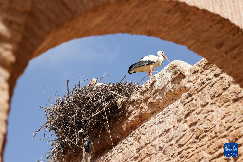 這是8月1日在摩洛哥首都拉巴特拍攝的棲居在舍拉考古遺址的鸛鳥。 舍拉考古遺址是摩洛哥首都拉巴特的著名旅游景點,由舍拉古城和摩洛哥梅里尼德王朝時期的皇家陵寢遺址組成。 新華社記者 霍晶 攝