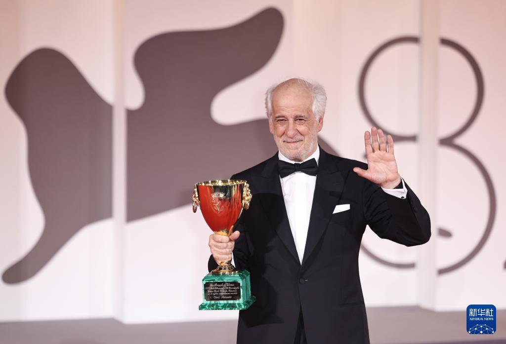 9月6日,在意大利威尼斯,最佳男演員獎獲得者、電影《恩典》演員托尼·瑟維洛與獎杯合影。 第82屆威尼斯國際電影節(jié)6日晚在意大利水城威尼斯的利多島落下帷幕。 新華社記者 李京