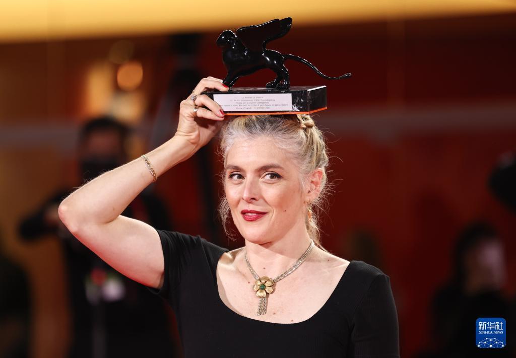 9月6日,在意大利威尼斯,最佳劇本獎獲得者、電影《執(zhí)筆》導演瓦萊麗·唐澤利與獎杯合影。 第82屆威尼斯國際電影節(jié)6日晚在意大利水城威尼斯的利多島落下帷幕。 新華社記者 李京 攝 |