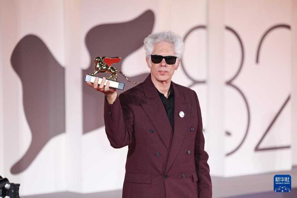 9月6日,在意大利威尼斯,最佳影片金獅獎《父母姐弟》的導演吉姆·雅穆施與獎杯合影。 第82屆威尼斯國際電影節(jié)6日晚在意大利水城威尼斯的利多島落下帷幕。 新華社記者 李京 攝