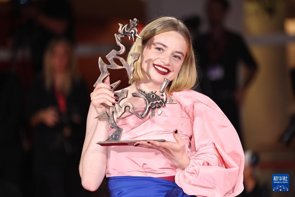 9月6日,在意大利威尼斯,最佳新演員獎獲得者、電影《寂靜的朋友》演員盧娜·韋德勒與獎杯合影。 第82屆威尼斯國際電影節(jié)6日晚在意大利水城威尼斯的利多島落下帷幕。 新華社記者 李京 攝