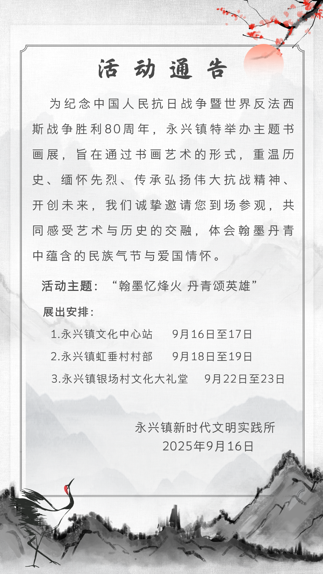 一筆一畫繪崢嶸,一紙一墨憶初心。9月16日,一場以 “翰墨憶烽火 丹青頌英雄”紀念中國人民抗日戰爭暨世界反法西斯戰爭勝利80周年為主題的書畫展在永興鎮文化站開展。展覽一經開放,便吸引了不少干部群眾、學生組團前來參觀。
